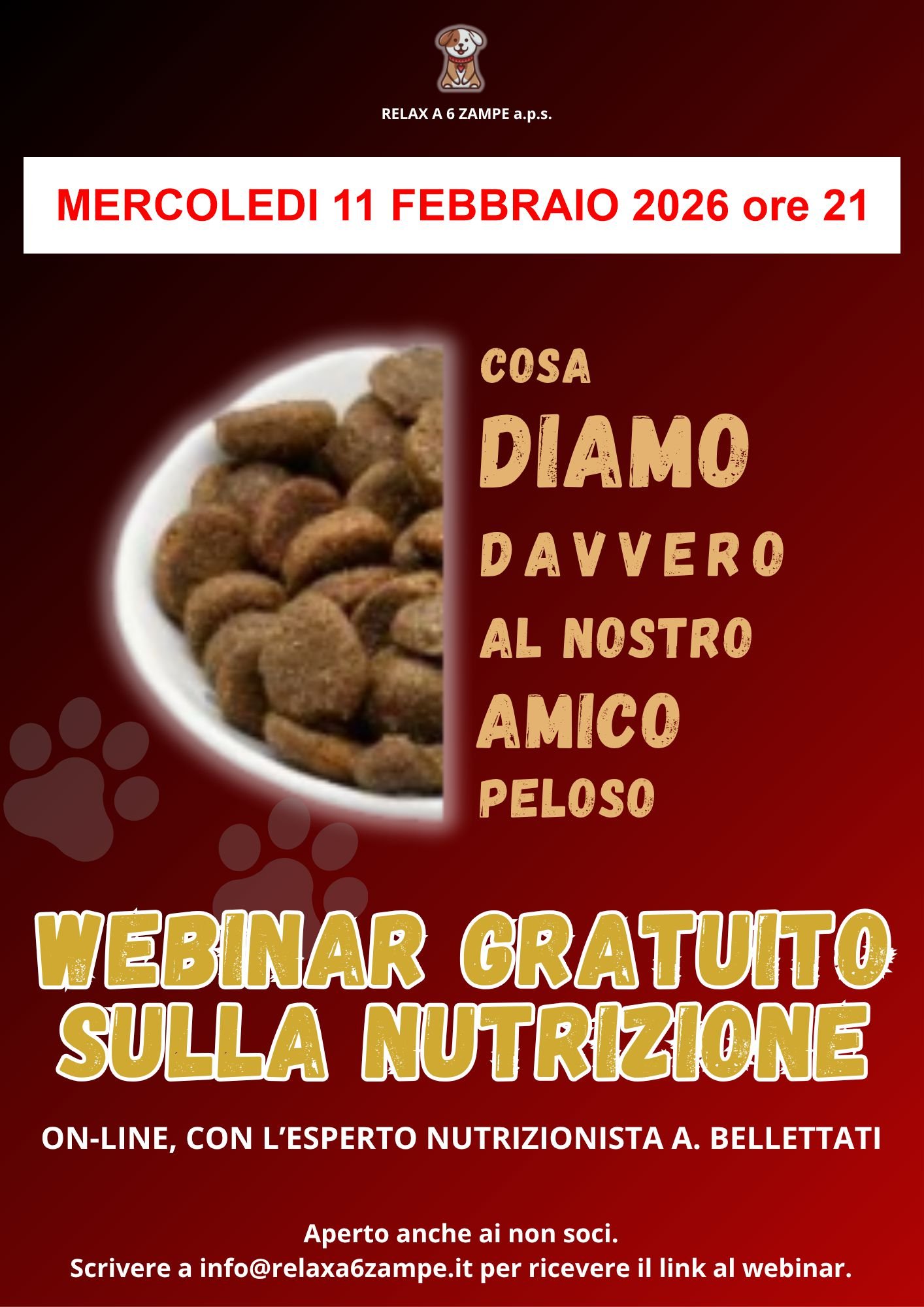 Un webinar on-line aperto a tutti (anche ai non soci) a scopo divulgativo-informativo sulle esigenze nutrizionali dei nostri amici a 4 zampe (principalmente cani e gatti).